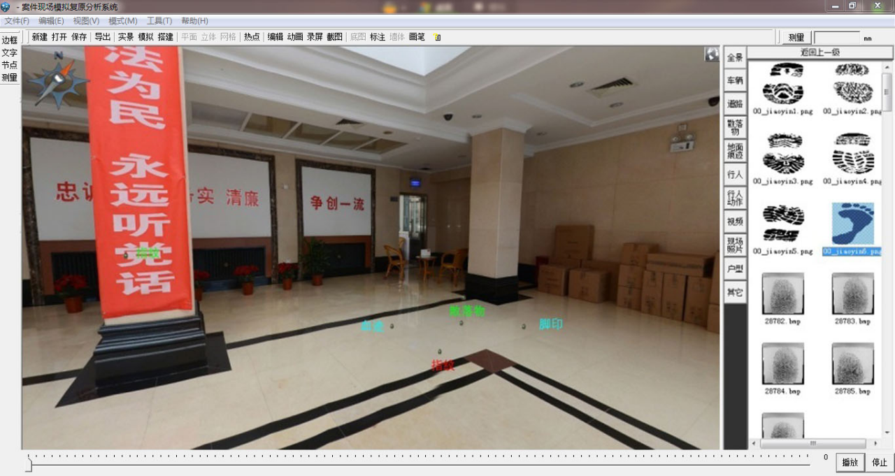 在真實的案發(fā)現(xiàn)場中需要拍攝大量的現(xiàn)場細節(jié)圖像,如:腳印、手印、血跡和煙頭等。案件現(xiàn)場模擬復原分析系統(tǒng)的熱點添加功能可以將所有采集到的現(xiàn)場細節(jié)圖像以超級鏈接方式添加到現(xiàn)場全景圖和三維重建現(xiàn)場中,并且可以用鼠標雙擊放大凸顯細節(jié)圖像,還可以創(chuàng)建文件夾對物證圖像進行組織分類、可重命名以及刪改細目照片資源,為案情分析帶來極大的幫助。