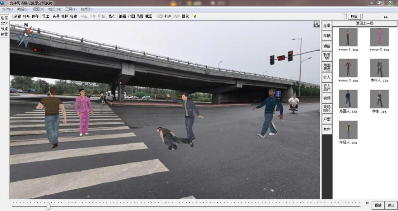 案件現(xiàn)場模擬復原分析系統(tǒng)內(nèi)建強大的三維動畫引擎,可以對三維人物和車輛等模型進行三維動畫的創(chuàng)建和編輯。根據(jù)刑偵人員對現(xiàn)場案發(fā)過程的推理,通過拖拽的方式即可進行人物和車輛模型的動畫創(chuàng)建。