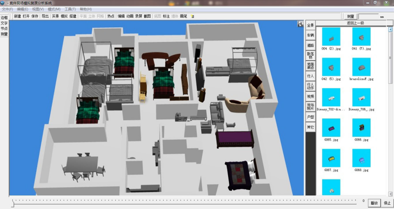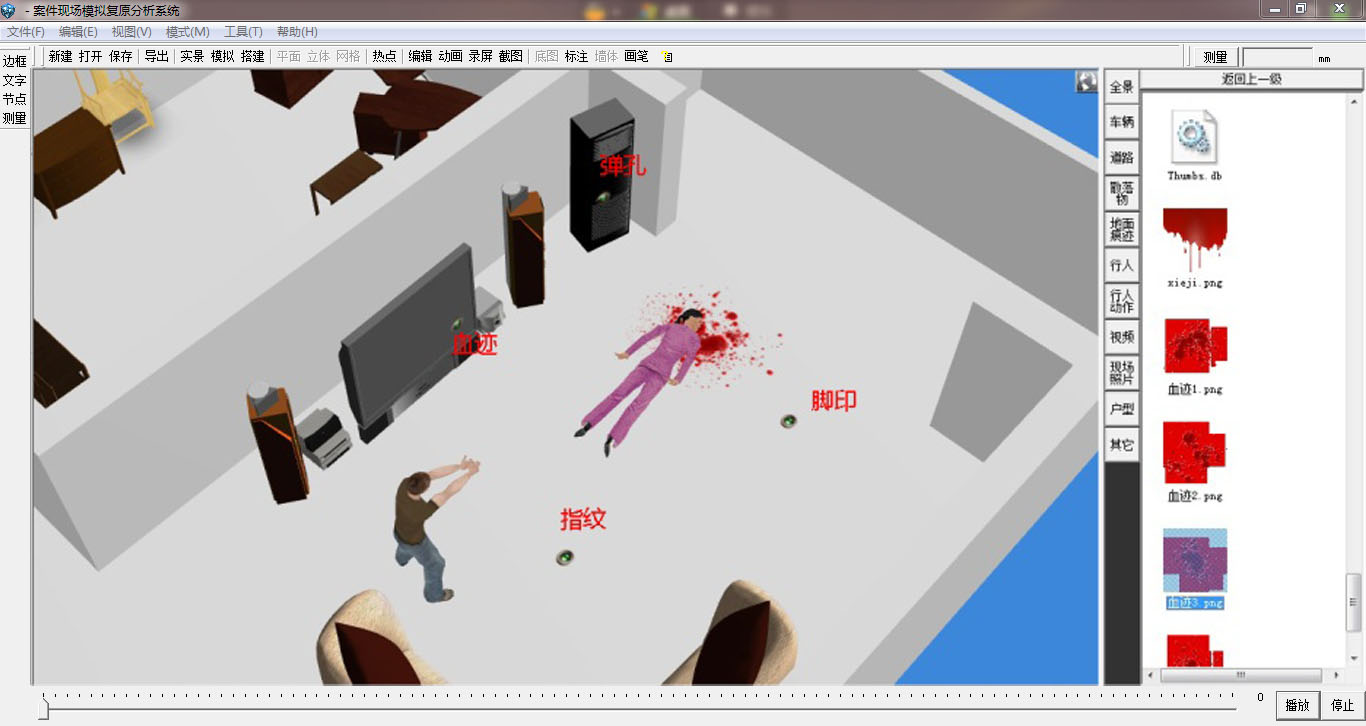 借助海量的三維模型資源庫和簡單的拖拽操作方式,案件現(xiàn)場模擬復原分析系統(tǒng)可在幾分鐘之內(nèi)創(chuàng)建一個與真實場景極為接近的三維重建現(xiàn)場。