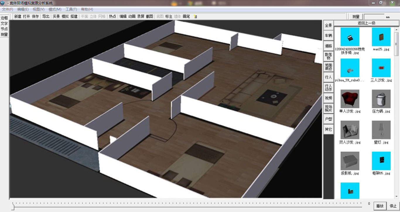 案件現(xiàn)場復原分析系統(tǒng)依托公安系統(tǒng)需求的調(diào)研數(shù)據(jù),以及自身在虛擬現(xiàn)實和三維仿真技術,建立了一個龐大專業(yè)的模型資源庫,三維模型達兩萬多種。其中包括室內(nèi)的家具、家電、廚具、辦公設備等,室外的車輛、道路、公共設施等三維模型,可以完全滿足案發(fā)現(xiàn)場三維重建的需要。