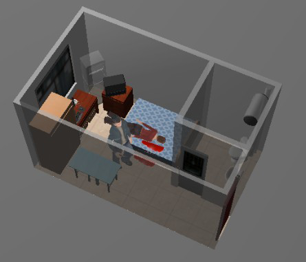 昌平區(qū)公安局刑偵大隊立即成立“7.23”專案組,對此案進行偵查,并連夜召開了案情分析會。刑偵科技支隊的民警使用案件現(xiàn)場模擬復原分析系統(tǒng)將整個案發(fā)現(xiàn)場的全景圖在會上進行了重現(xiàn),并且利用自定義三維場景快速復原功能和三維人物交互功能,將整個案發(fā)過程進行了模擬,并且根據(jù)刑偵支隊民警現(xiàn)場討論的結果,進行了事故的現(xiàn)場還原模擬。