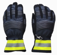 手掌為深灰色,手背藏藍色;采用3D立體設(shè)計,符合人體手型自然 彎 曲 ; 手 背 由 外 向 里 , 分 為 五層;第一層為反光標(biāo)識帶,手背設(shè)1條阻燃反光標(biāo)識帶,顏色為黃銀黃 ; 第 二 層 為 4 0 % 間 位 芳 綸 和6 0%對位芳綸梭織布;第三層為阻燃無紡布;第四層為低透防水膜,性能穩(wěn)定,與里子和外殼均不脫落;第五層為凱夫拉針織布,顏色為黃色。